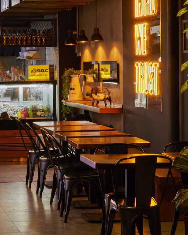 Especialistas en costillas tiernas que se deshacen al tocarlas: el corazón de su propuesta está en los cortes de cerdo cocinados lentamente, con grasa noble y auténtico sabor americano. Su estilo urbano se realza con una ambientación industrial moderna que combina iluminación cuidada con arquitectura elegante.